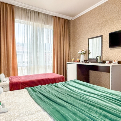 - При бронировании трёхместного номера, предоставляется размещение категории TWIN+ EXB ( стандартный номер с двумя раздельными кроватями + дополнительное спальное место( возможно раскладушка))
